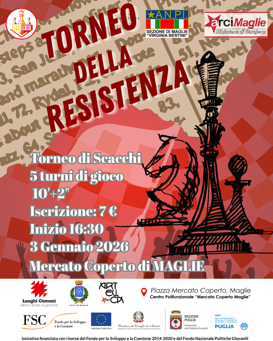 Sabato 3 gennaio, ore 16:30, torneo semilampo promozionale, c/o Centro Polifunzionale, Mercato Coperto, Largo San Pietro #Maglie - Organizzato dalla sezione ANPI Maglie - V. Bertini con la collaborazione di Lecce Scacchi ASD - Cadenza: 10+2 - Turni: 5 - Quota: 7€ (Ridotta 5€ per soci e tesserati Lecce Scacchi ASD, ANPI e ARCI) - Bando e preiscrizioni da qui: https://docs.google.com/forms/d/e/1FAIpQLSdu5bXWOkPT1v3mb-Abd9PJdGSpXfTNdzX1XeFQAXQ7xL_I8Q/viewform?usp=send_form - Posizione: https://maps.app.goo.gl/rHCiZHoBrq7mEnVc7 Pubblicato il 29/12/2025 |